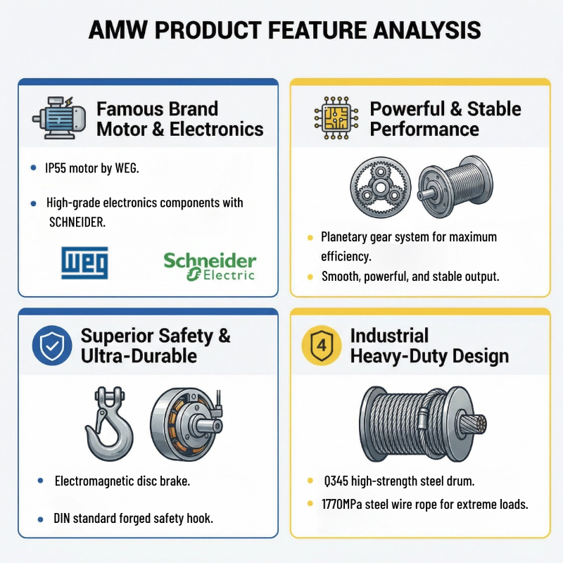 Hochwertige Komponenten – WEG-Motor, Schneider-Steuerungen und hochfester Stahlseilzug in jedem ALLMAN AMW-S-Serie-Hebwinch.