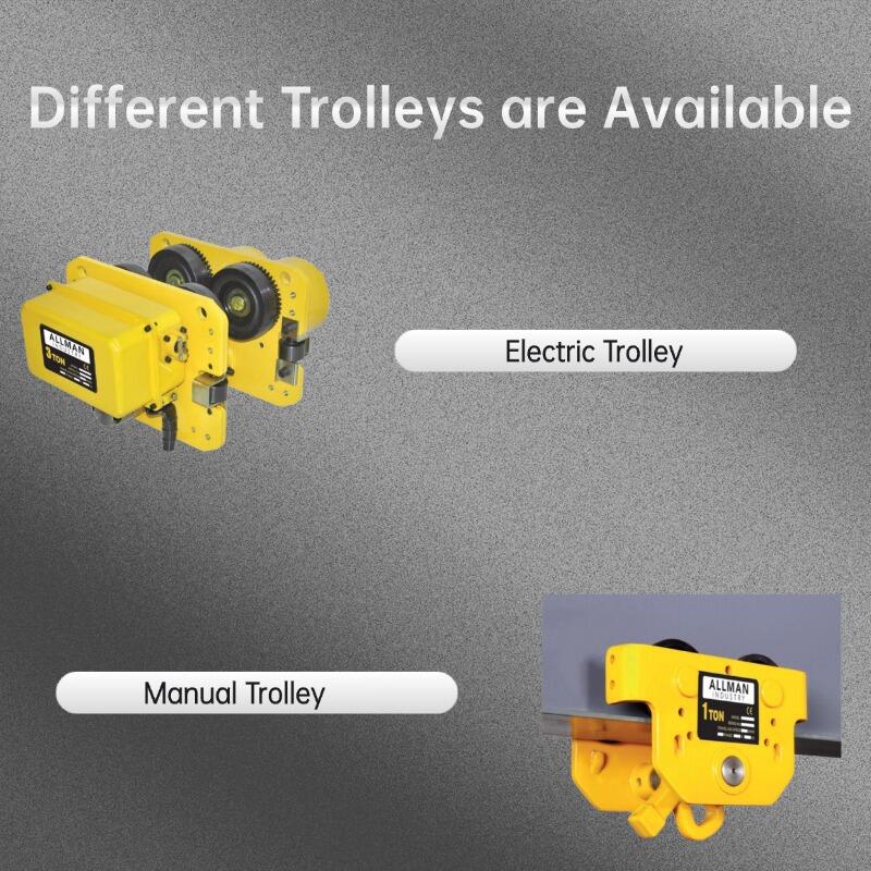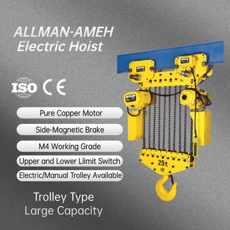 ALLMAN AMEH-Serie Elektrisch Der elektrische Kettenzug mit Laufkatzen-Ausführung ist so konstruiert, dass er Mobilität und Effizienz in Ihre Materialhandhabungsprozesse bringt. Dieser industrielle Kettenzug ist für ein reibungsloses Fahren entlang von Trägern ausgelegt und erweitert Ihre Hubabdeckung über Arbeitsstationen, Montagelinien und Lagerhallen hinweg. — wodurch es zu einem unverzichtbaren Werkzeug für Werkstätten und Fabriken weltweit wird.