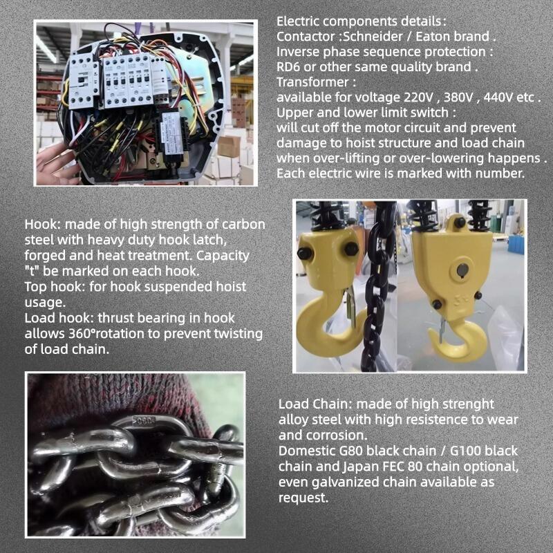 Als schwerlastfähiger elektrischer Kettenzug Kette , liefert er eine konstante Leistung für Lasten bis zu 25 Tonnen, unterstützt durch einen Motor mit Wicklung aus hochreinem Kupfer und eine präzise Getriebegruppe für einen ruhigen, geräuscharmen Betrieb. Sicherheit ist durch ein seitliches magnetisches Bremssystem, einen Transformator für sichere Steuerspannung sowie einen Schutz vor falscher Phasenfolge gewährleistet. Ob mit elektrischem Laufwerk für automatisierte Bewegung oder manuellem Laufwerk für maximale Flexibilität betrieben – dieser Schwerlastfähige elektrische Kettenzug bietet zuverlässige Leistung mit der Einsatzklasse M4 und dem Schutzgrad IP54 als Standard.